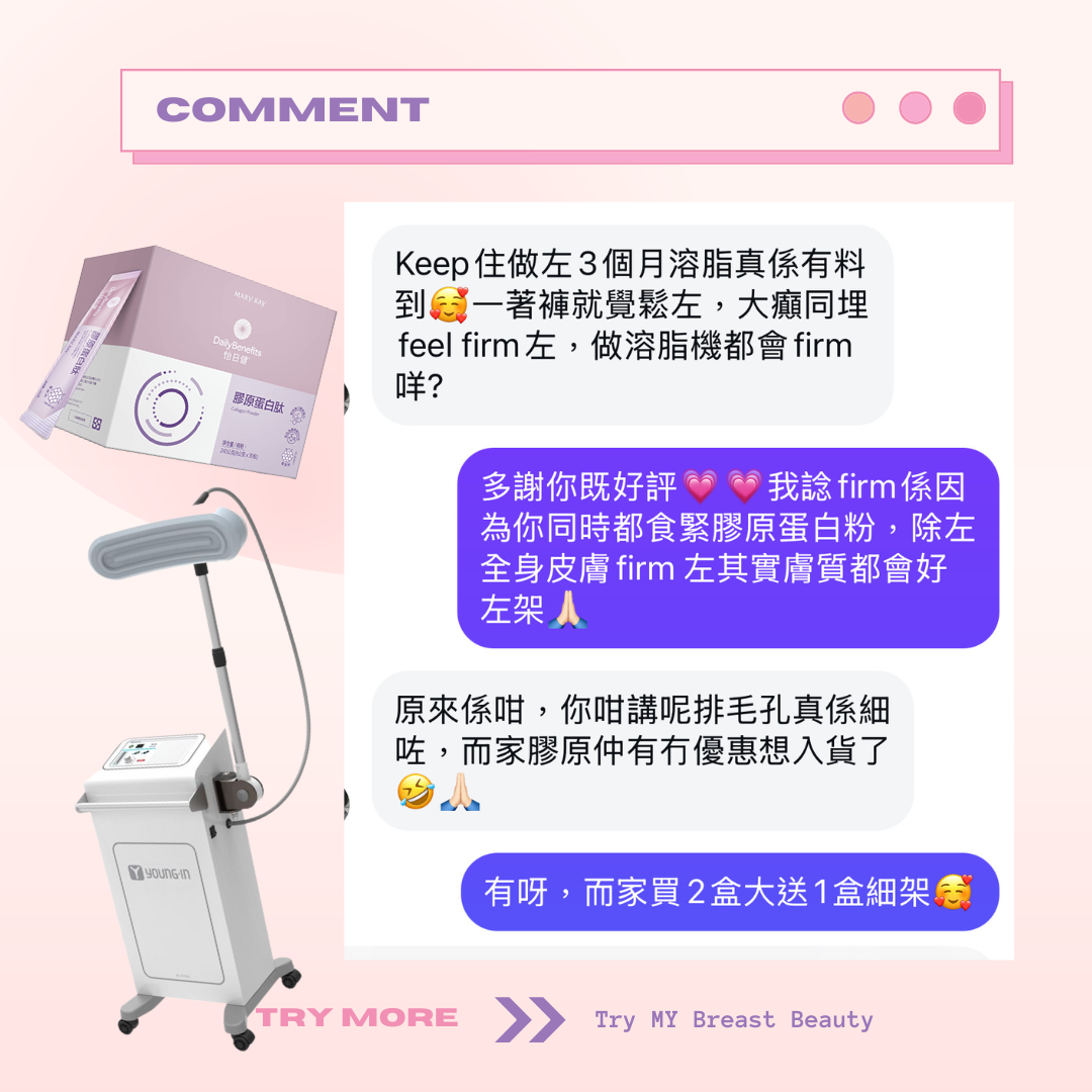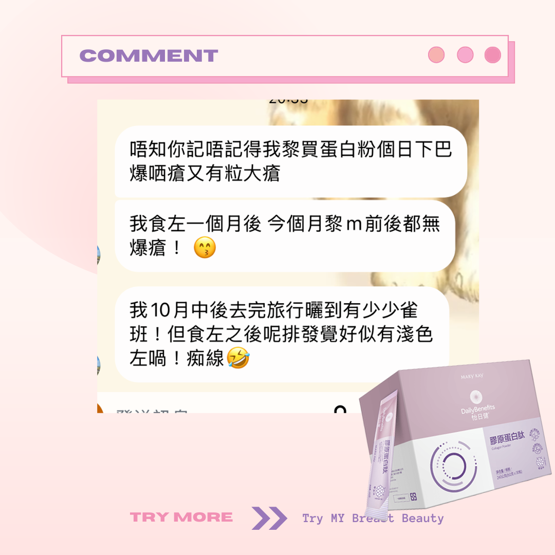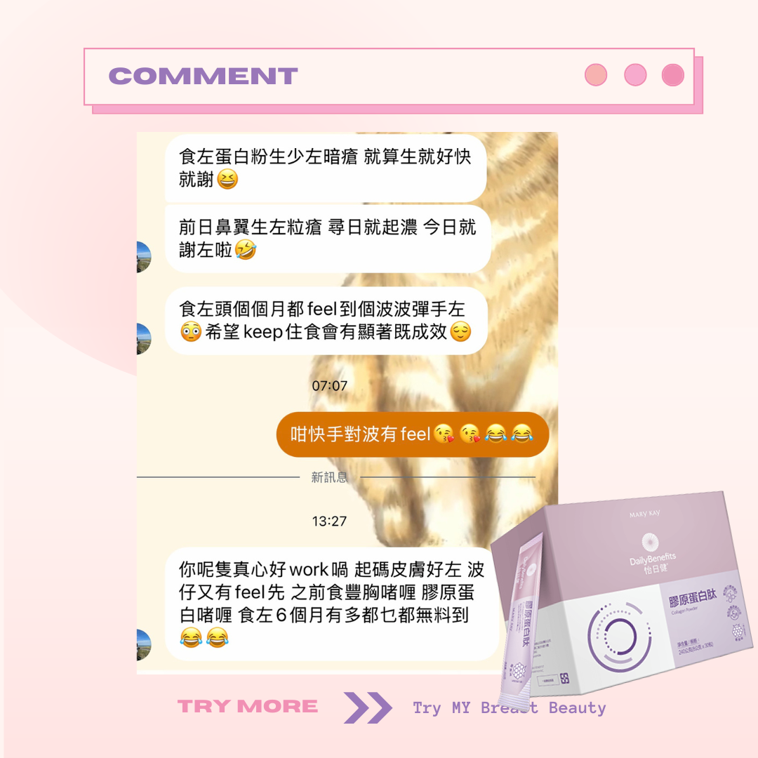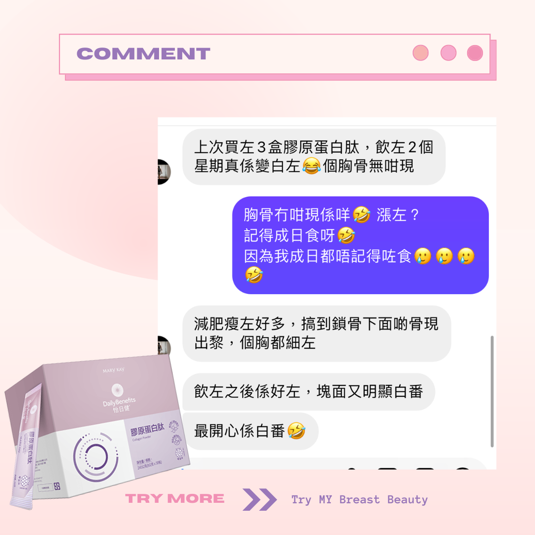 Marykay 膠原蛋白會幫你補充膠原蛋白。胸部因為年紀越大、膠原蛋白流失,都會係影響胸部大細嘅因素。膠原蛋白肽除咗可以改善胸形,仲會同時改善肌膚彈性、面部細紋。成份天然到孕婦同餵母乳媽媽都可以飲用。味道類似提子味😜唔會好腥嘅味道~