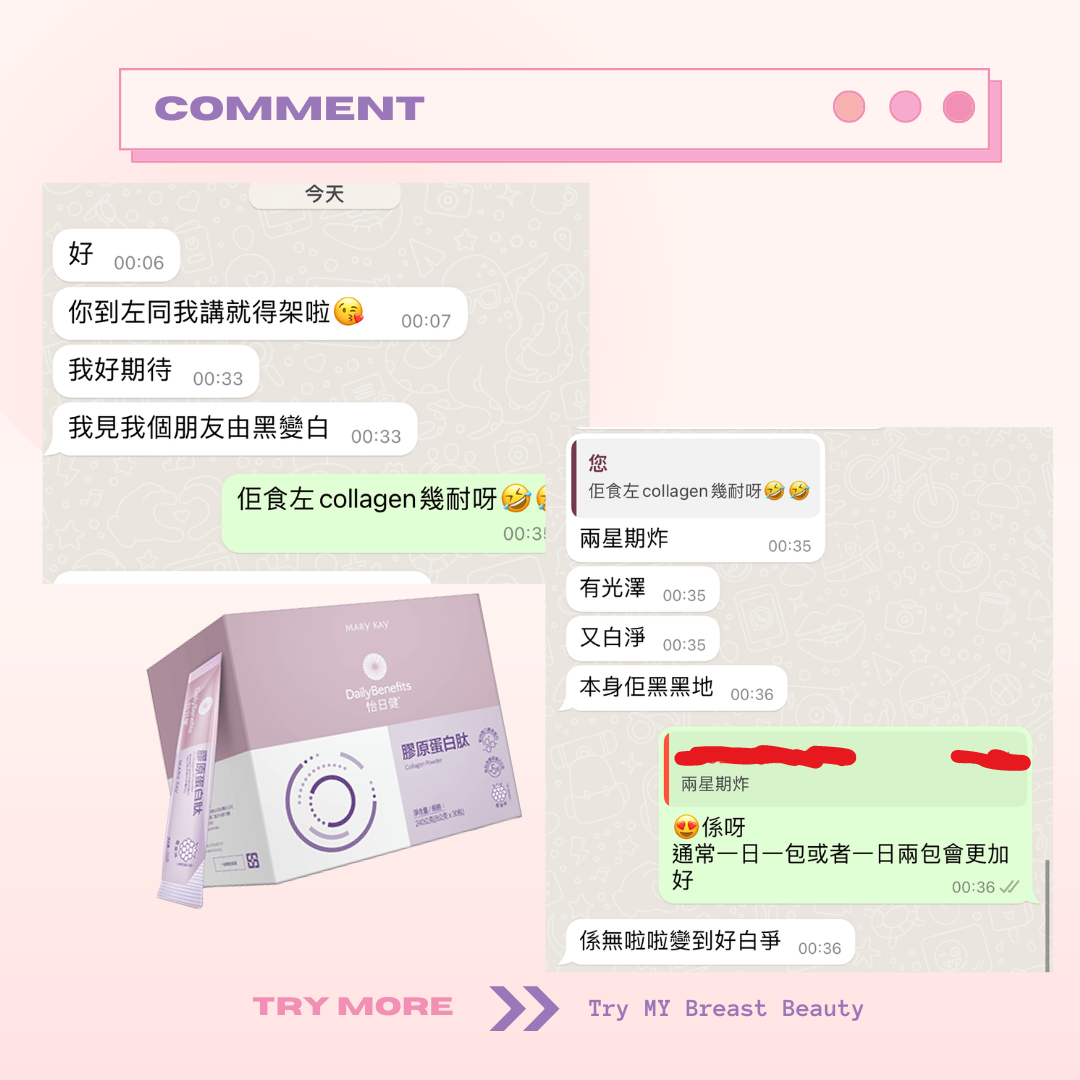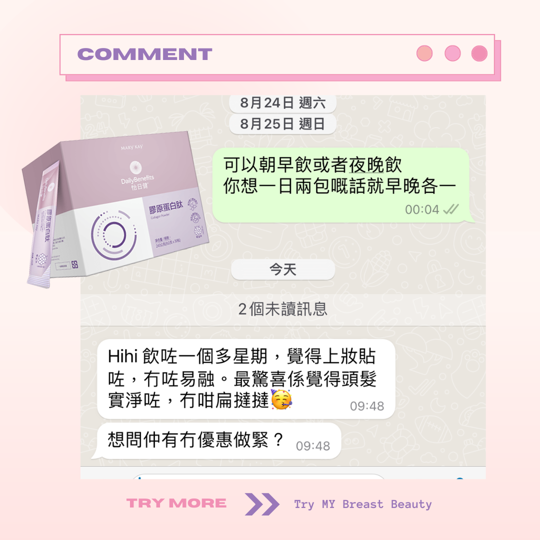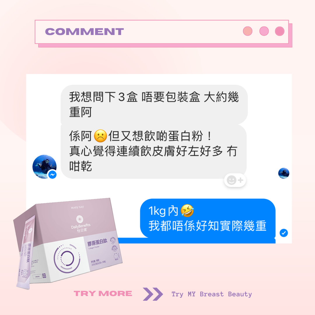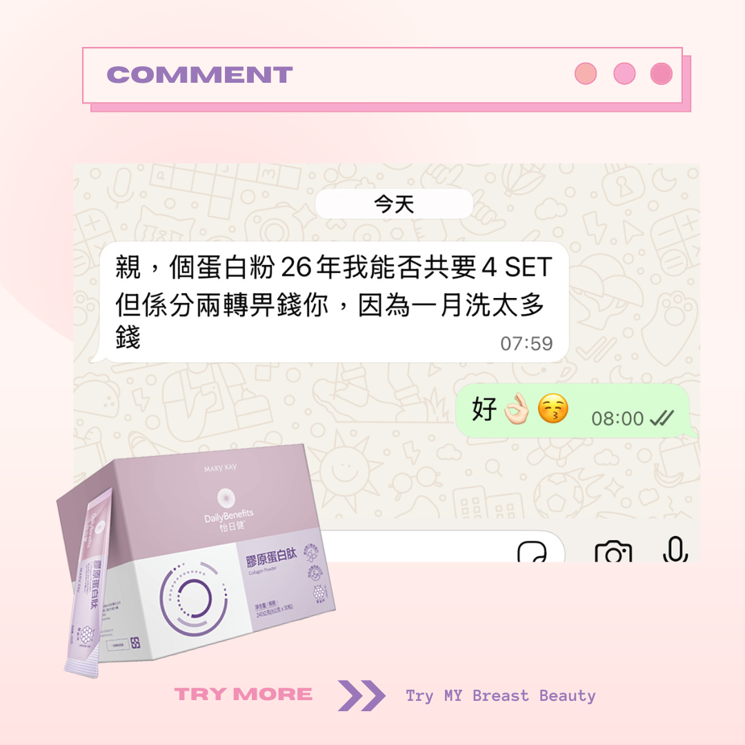 Marykay 膠原蛋白會幫你補充膠原蛋白。胸部因為年紀越大、膠原蛋白流失,都會係影響胸部大細嘅因素。膠原蛋白肽除咗可以改善胸形,仲會同時改善肌膚彈性、面部細紋。成份天然到孕婦同餵母乳媽媽都可以飲用。味道類似提子味😜唔會好腥嘅味道~