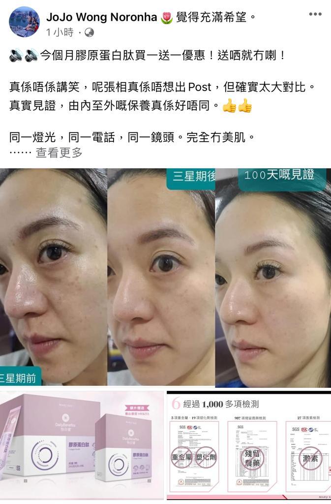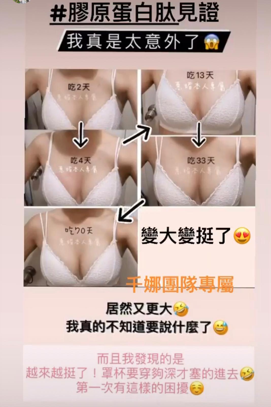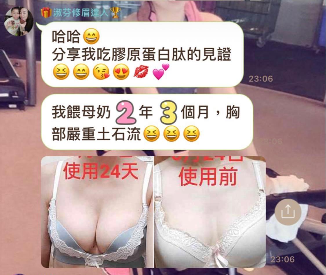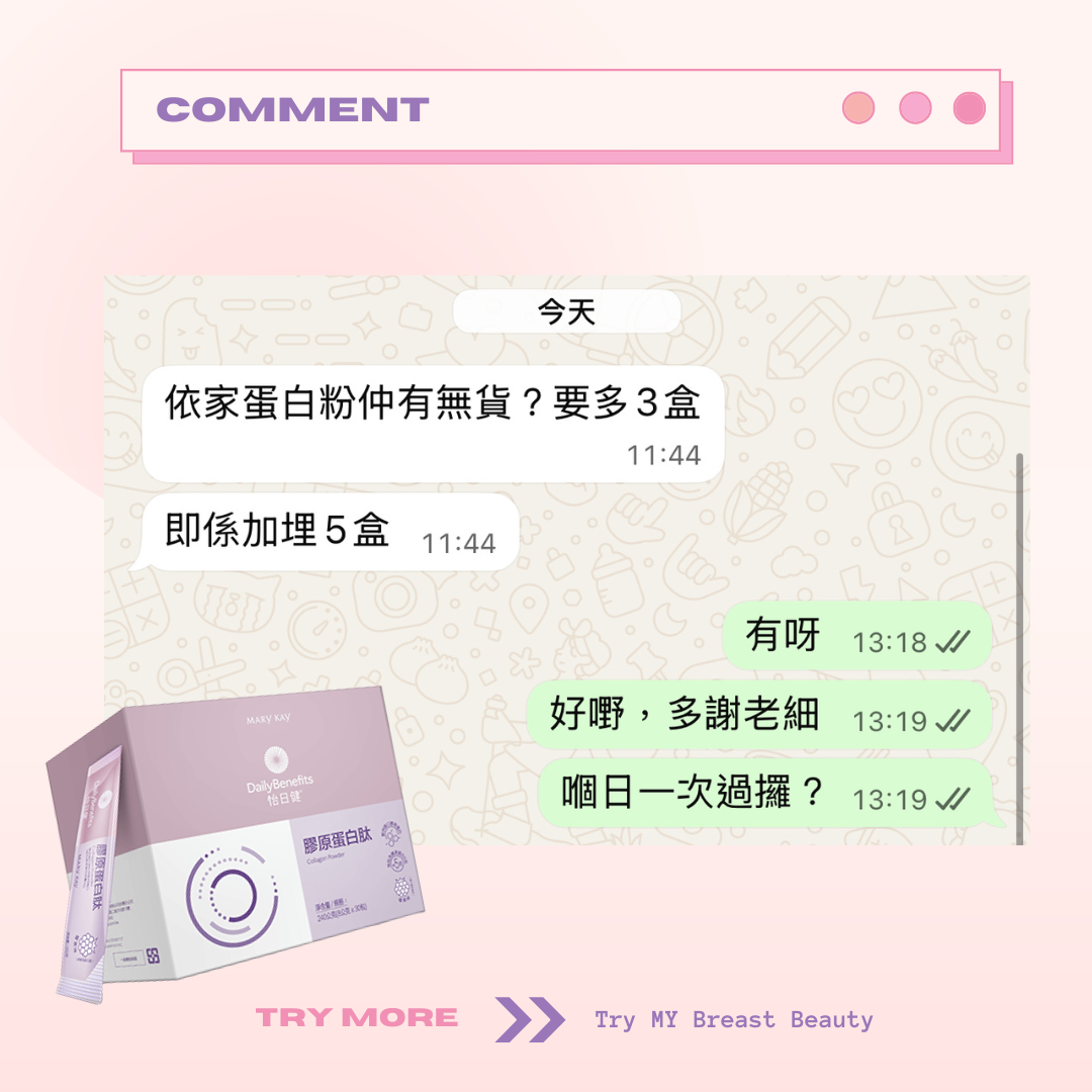 Marykay 膠原蛋白會幫你補充膠原蛋白。胸部因為年紀越大、膠原蛋白流失,都會係影響胸部大細嘅因素。膠原蛋白肽除咗可以改善胸形,仲會同時改善肌膚彈性、面部細紋。成份天然到孕婦同餵母乳媽媽都可以飲用。味道類似提子味😜唔會好腥嘅味道~
