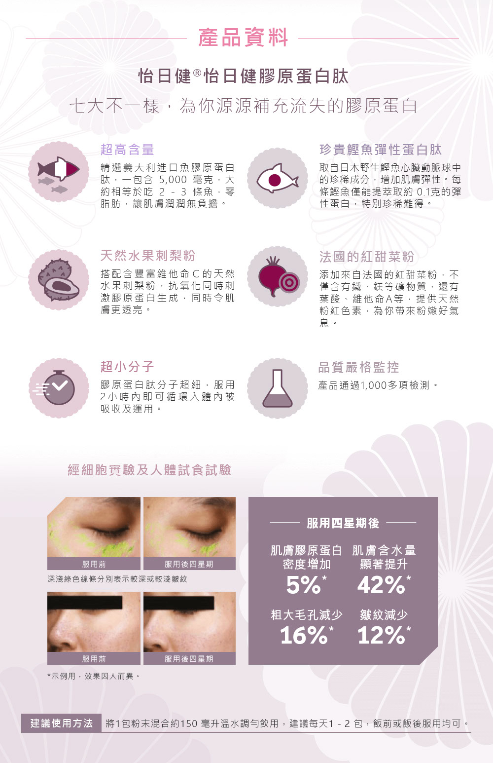 - 高含量 – 每包含5,000毫克義大利進口魚膠原蛋白肽,大約相等於吃 2-3條魚